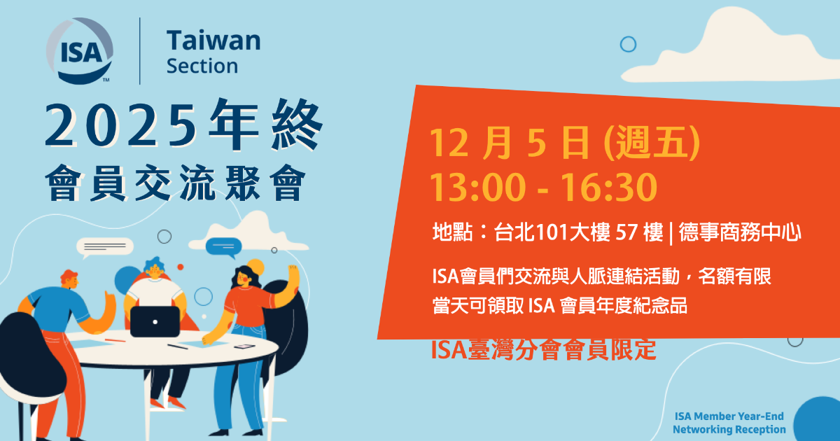 邀請您參加2025年國際自動化協會(ISA)臺灣分會的專業聚會,在快速變遷的自動化產業 (Industrial Automation) 中,掌握最新趨勢與建立深度的人脈連結,是專業人士不可或缺的致勝關鍵。對於專注於 ISA/IEC 62443 標準、OT資安 (營運技術安全) 及 物聯網應用的行業夥伴而言,一個高品質的交流平台更顯珍貴。